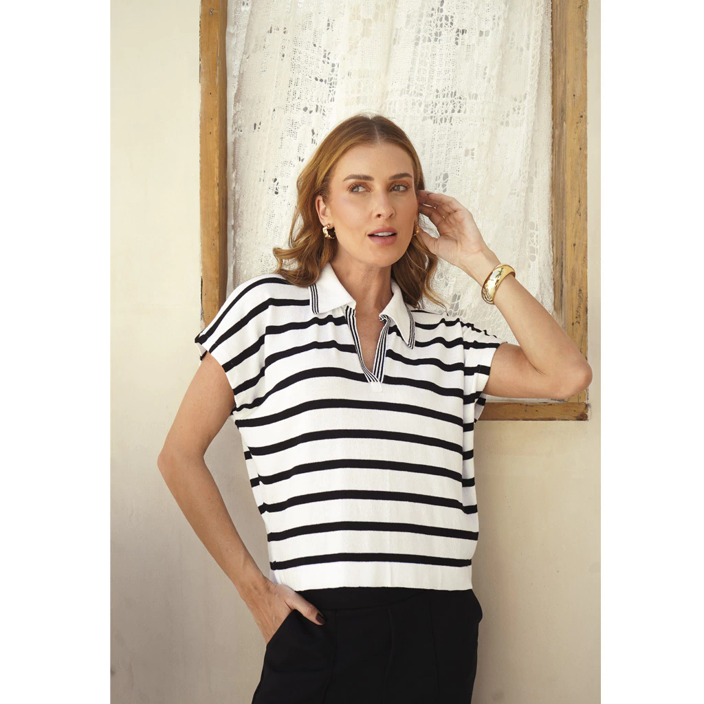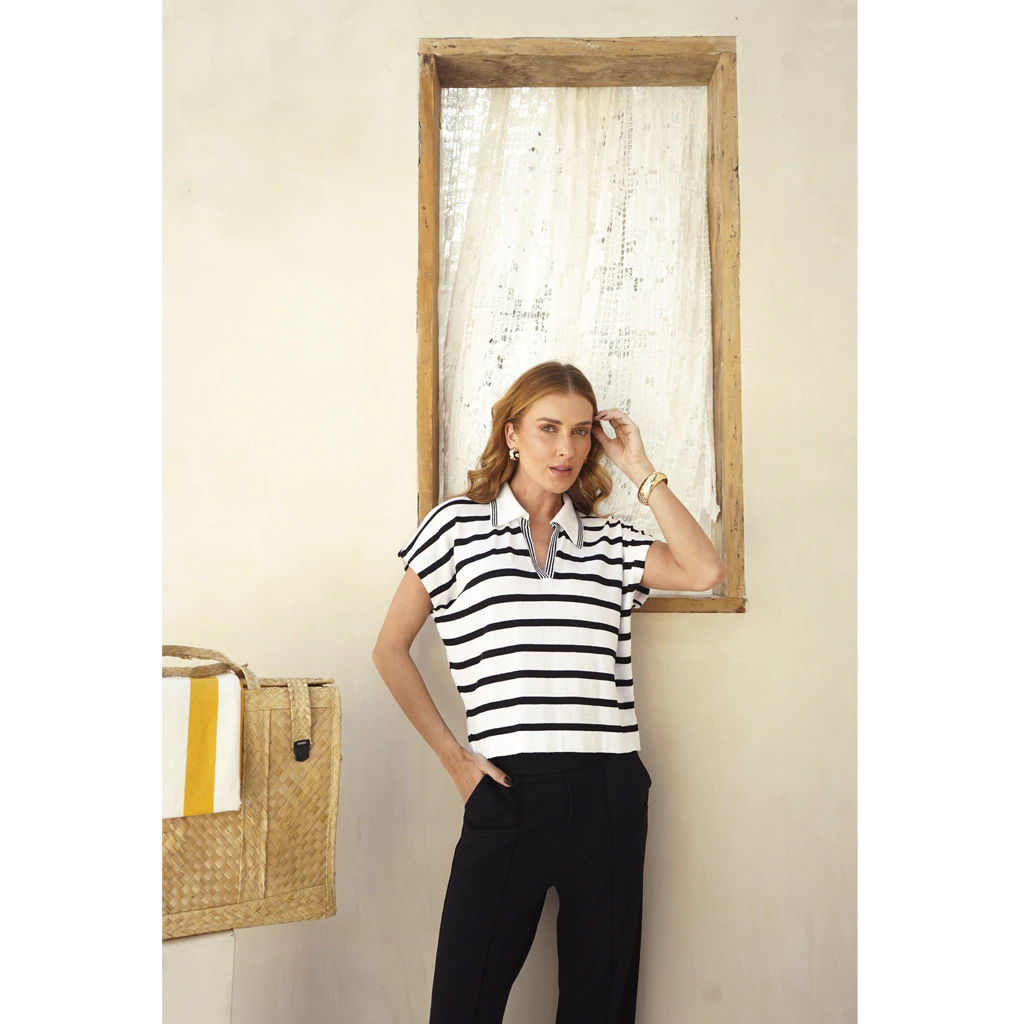 Blusa Tricot Polo Listrada Monica – a peça que faltava para renovar seu guarda-roupa com estilo e conforto!