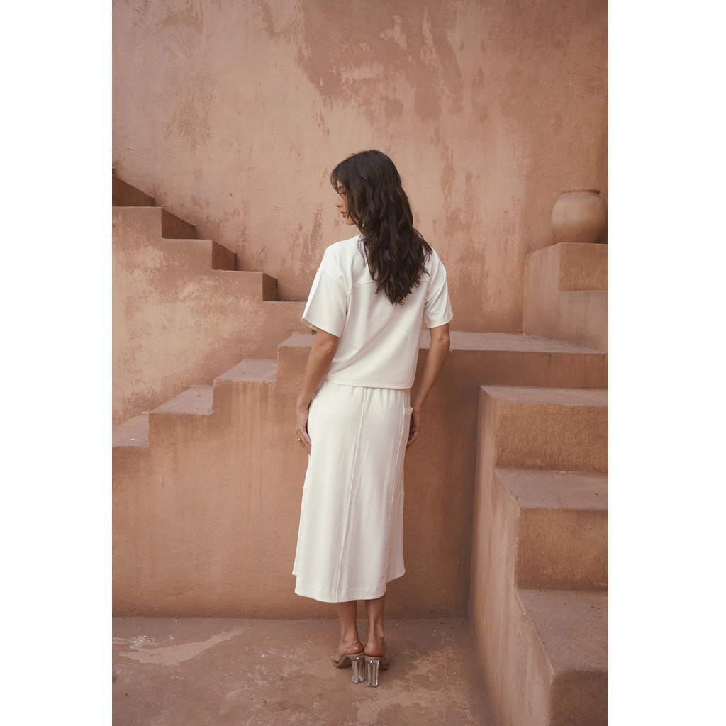 A blusa traz detalhes de recortes que adicionam um toque moderno e sofisticado, valorizando o visual de forma única. Já a saia destaca-se pela elegante fenda frontal, que confere sensualidade e movimento ao look, ideal para ocasiões casuais ou eventos especiais.