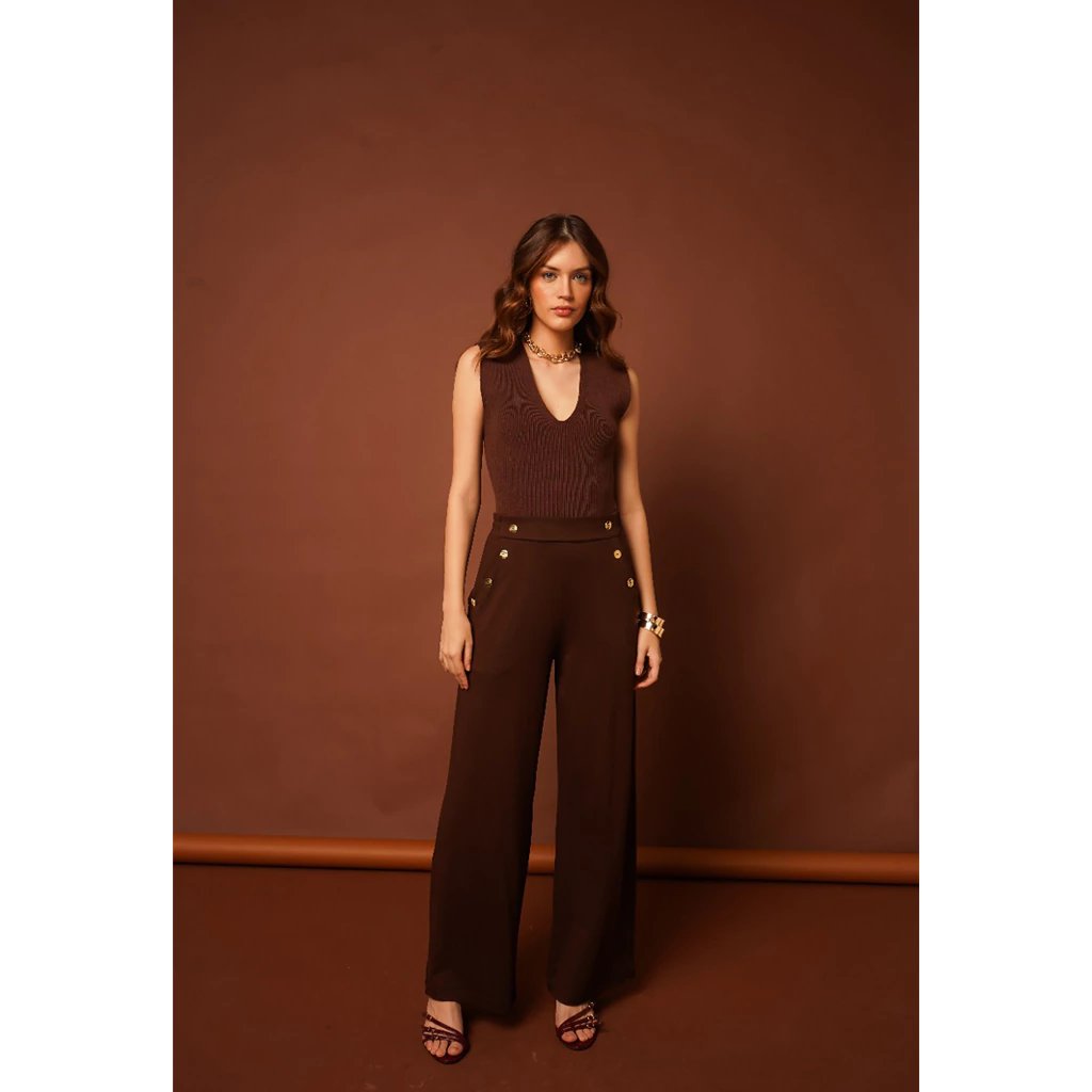 Descubra o Macacão Magda, um verdadeiro ícone de elegância! Com busto em tricot que se ajusta perfeitamente ao seu corpo, ele exala sofisticação.