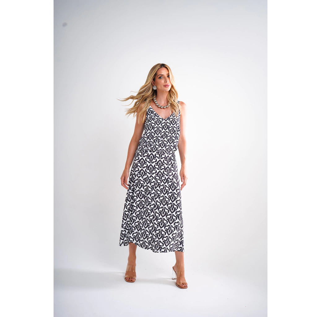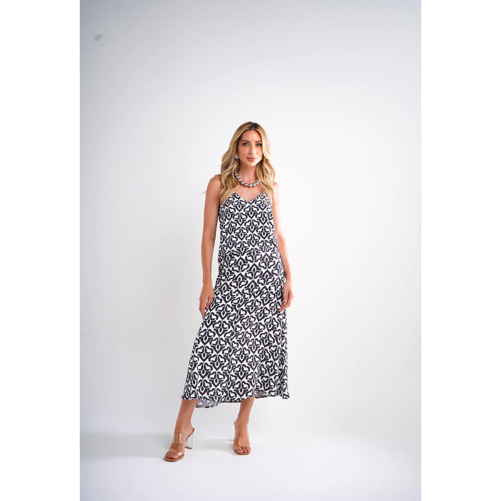 Com um design encantador, a regata possui alças finas que proporcionam um caimento leve e delicado. O detalhe no decote adiciona um toque de sofisticação, enquanto a estampa P/B traz um charme moderno e estiloso.