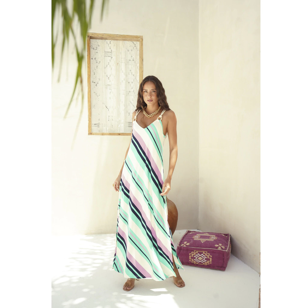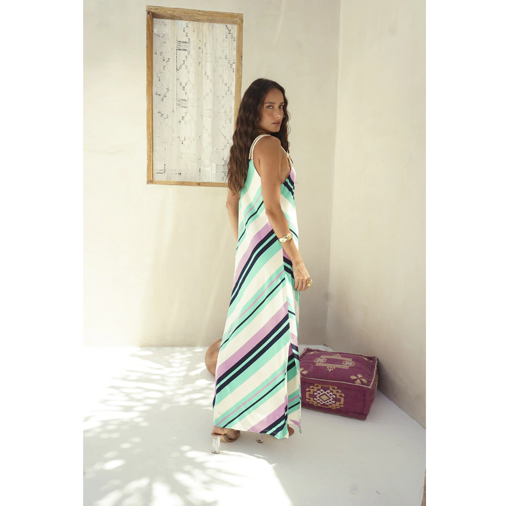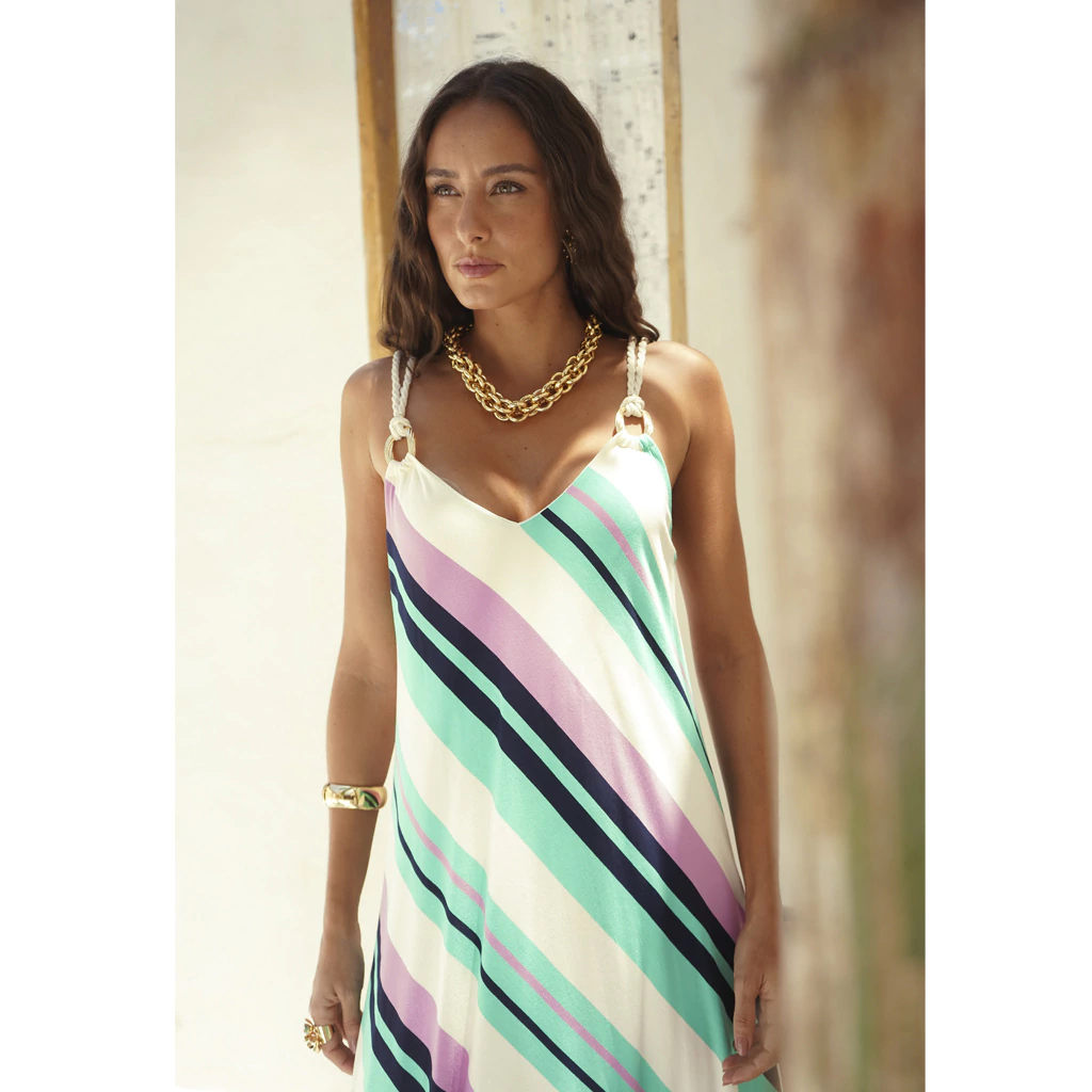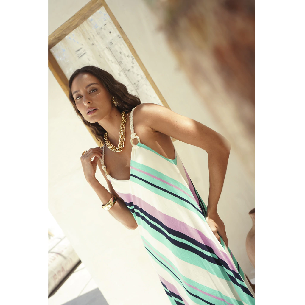 Este vestido longo em malha traz listras coloridas vibrantes e alças em cordão que destacam o decote em V, garantindo um visual leve e sofisticado.