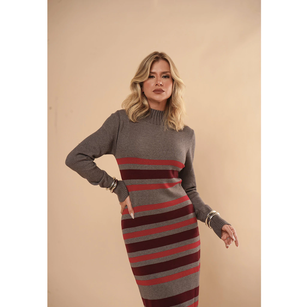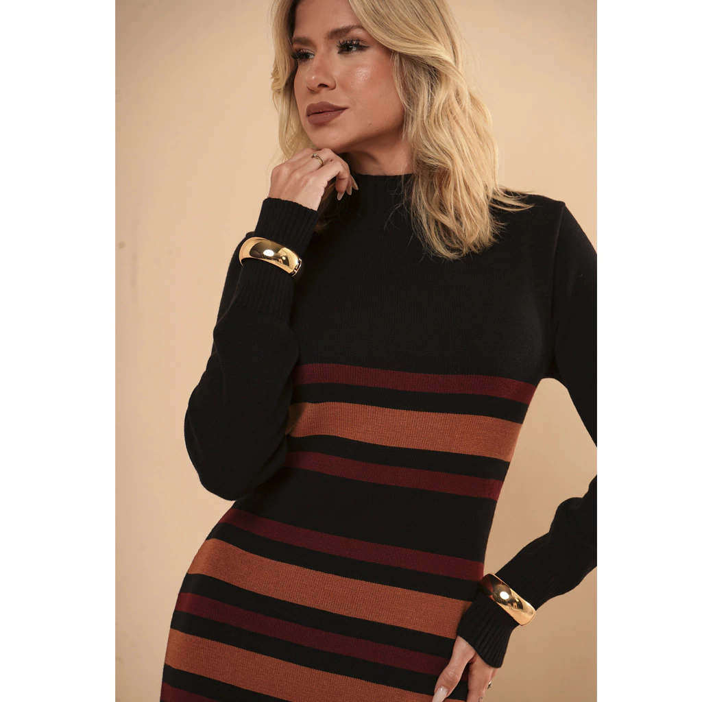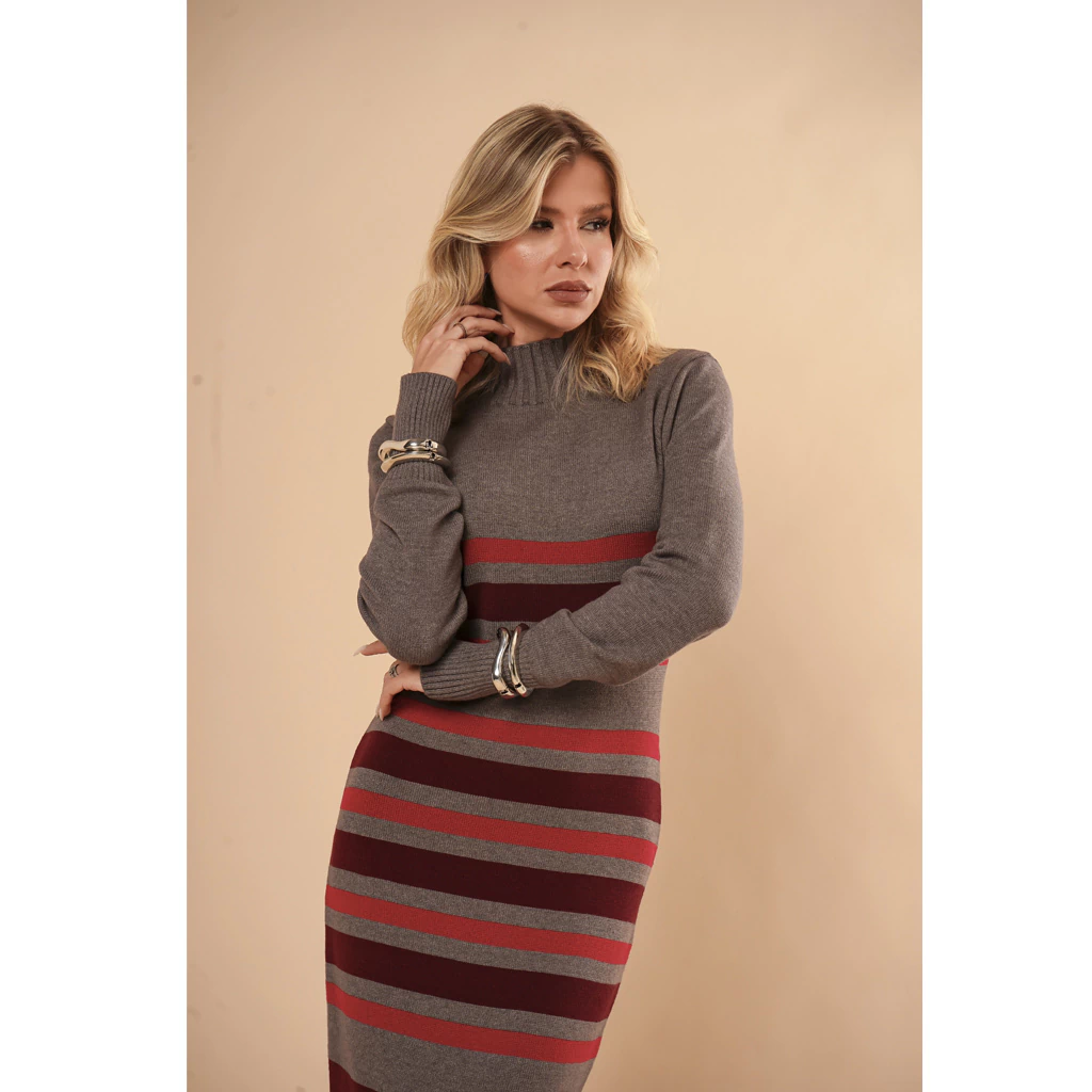 Descubra o charme irresistível do Vestido Tricot Listrado Gola Alta Maria! Com seu design listrado moderno e gola alta, esta peça une conforto e estilo para você arrasar em qualquer ocasião.
