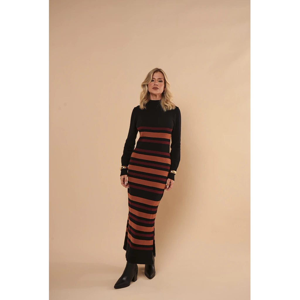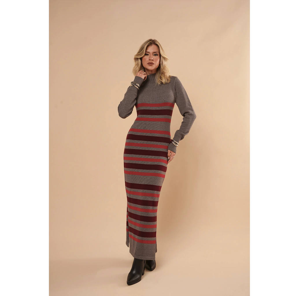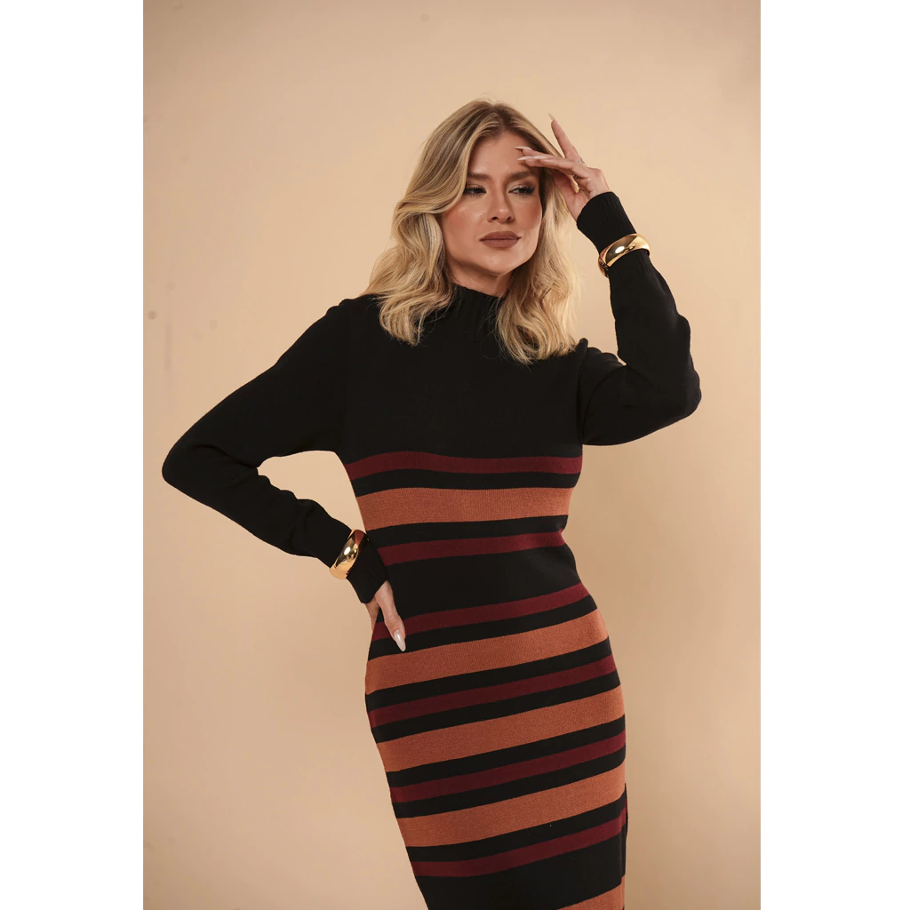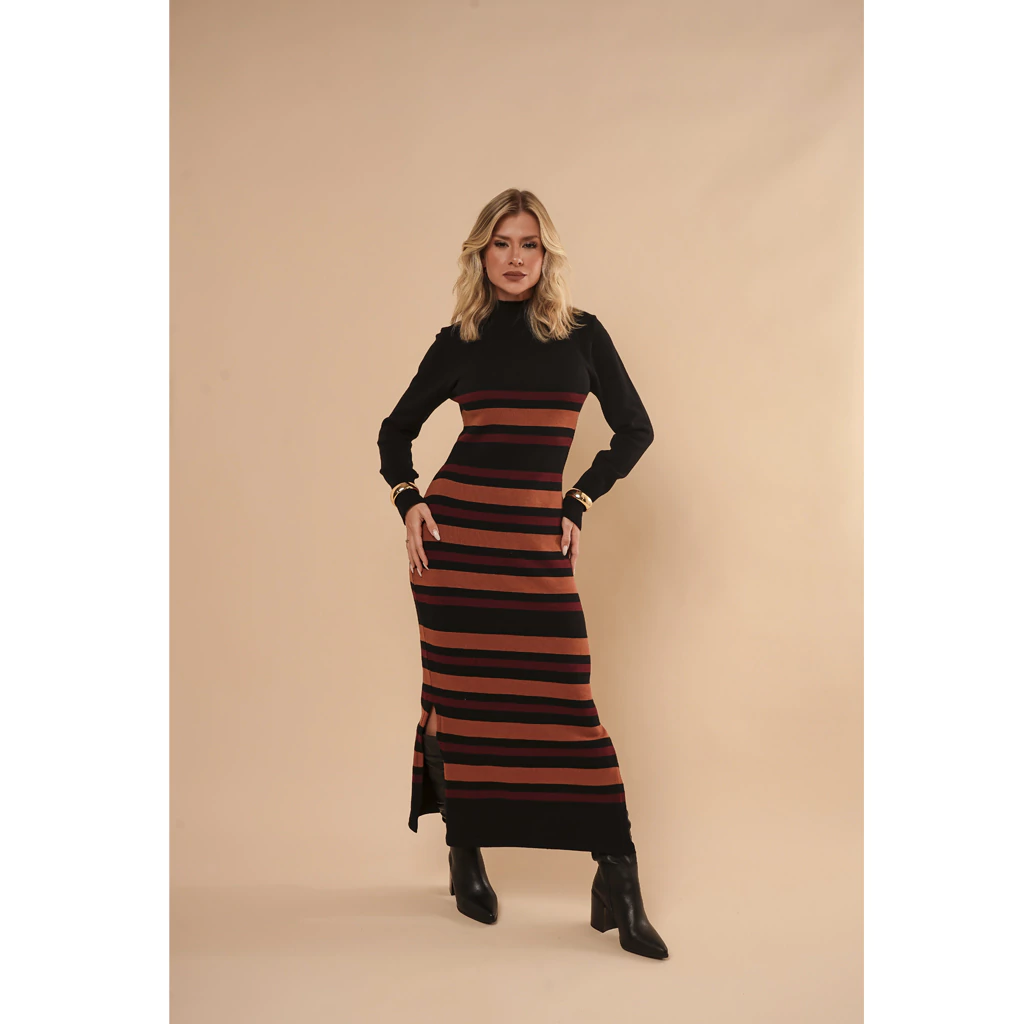 Descubra o charme irresistível do Vestido Tricot Listrado Gola Alta Maria! Com seu design listrado moderno e gola alta, esta peça une conforto e estilo para você arrasar em qualquer ocasião.